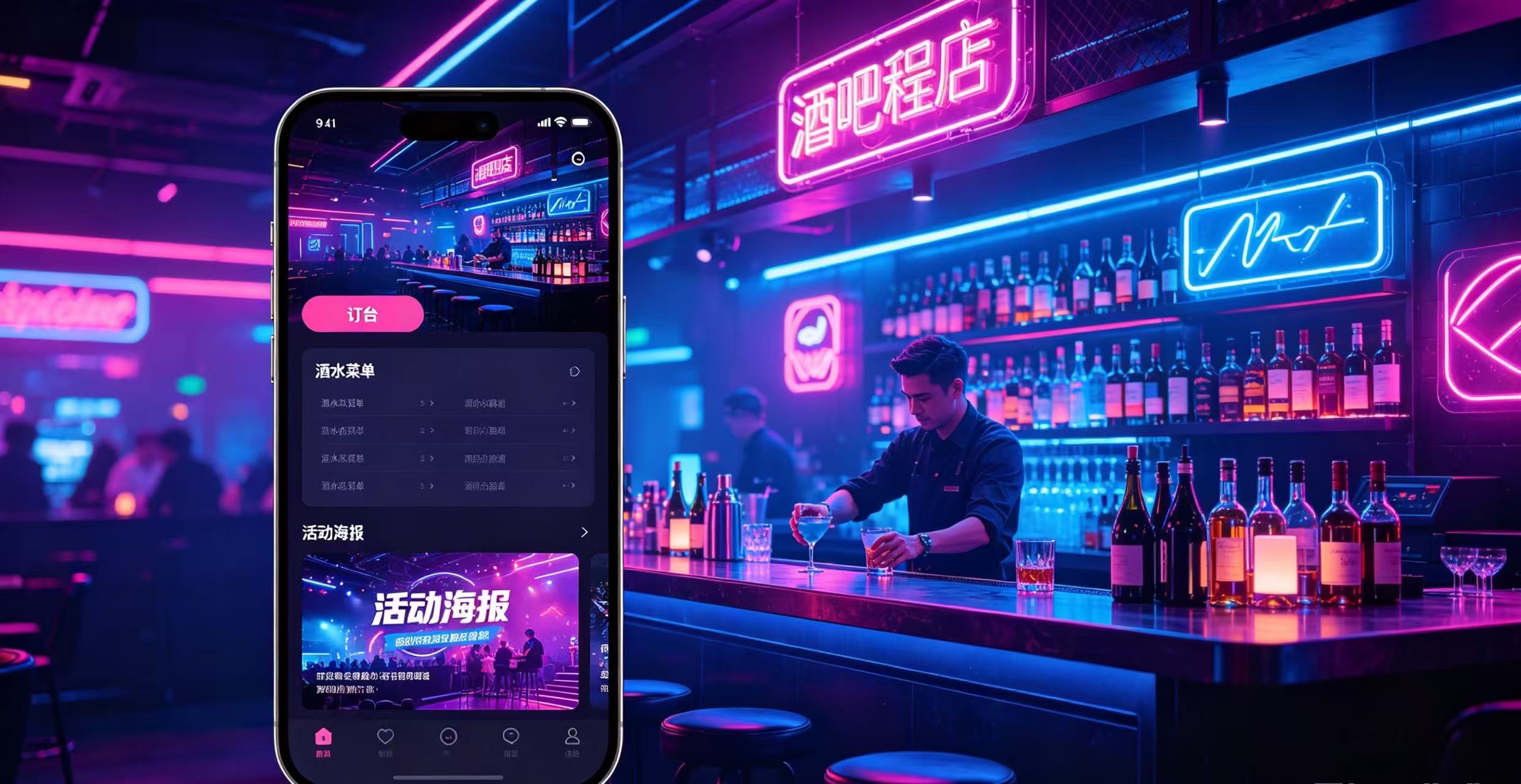 针对酒吧日常经营痛点,打造功能贴合、界面新潮、操作流畅的专属酒吧运营小程序解决